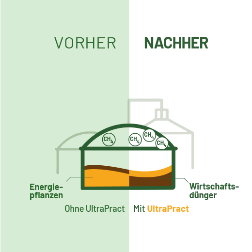 Darüber hinaus bewirkt UltraPract eine Aufspaltung abgestorbener Bakterien aus Wirtschaftsdüngern und erschließt so ein bisher ungenutztes Restgaspotential. Diese zusätzliche Substratquelle sorgt für signifikante Ertragssteigerungen. Höchste Enzymaktivitäten in dem für Biogasanlagen relevanten pH-Wert Bereich und hohe Temperaturtoleranzen garantieren eine nachweislich sichere Wirkung und Mehrertrag.