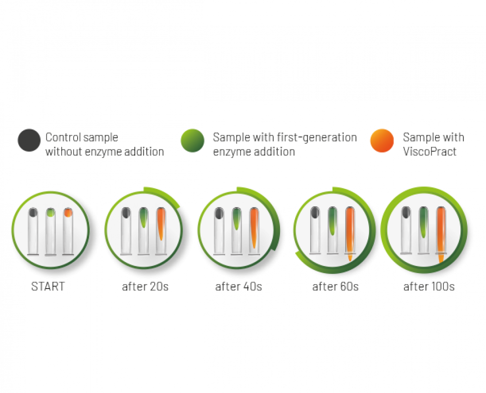 The suitability of ViscoPract for reducing viscosity is tested: Original fermenter samples are taken. No enzymatic additive is added to a control sample. ViscoPract and common 1st generation enzymes (e.g. competitor products) are added to the other samples.